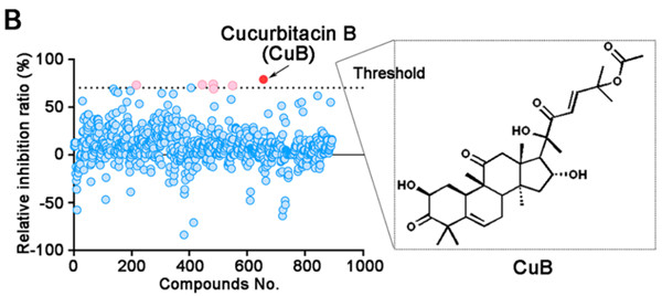 通過(guò)Biacore 8K的高通量抑制劑篩選實(shí)驗(yàn),作者得到了抑制劑篩選的排序。從圖2中可以直觀看出,六種具有較強(qiáng)抑制效果的天然產(chǎn)物被發(fā)現(xiàn),其中抑制效果最強(qiáng)的當(dāng)屬葫蘆素B(CuB)。在Huh增殖抑制實(shí)驗(yàn)中,葫蘆素B同樣表現(xiàn)出了抑制作用,72h時(shí)的IC50達(dá)到1.0 uM。